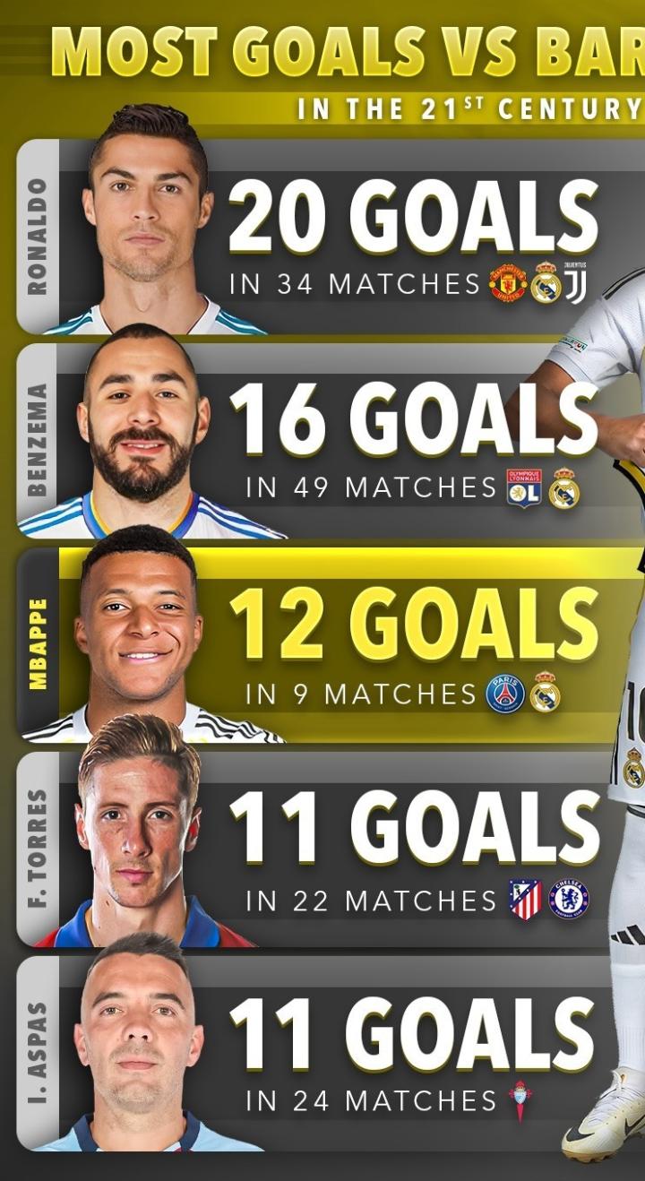 يېقىندا Scoree 90 سىتاتىستىكا قىلىپ 21 - ئەسىردىكى بارسېلونا بىلەن ئوينىغان مۇسابىقىلەردە ئەڭ كۆپ توپ كىرگۈزگەن توپچىلار تىزىملىكىنى ئىستاتىستىكىلاپ چىققان . كىرىستىيانو رونالدو 20 توپ ( 34 مەيدان ) بىلەن بىرىنچى ئورۇندا ، بېنزېما 16 توپ ( 49 مەيدان ) بىلەن ئىككىنچى ئورۇندا تۇرغان . مىباپپې گەرچە پەقەت توققۇز مەيدان مۇسابىقىلەشكەن بولسىمۇ ، لېكىن 12 توپ كىرگۈزگەن .