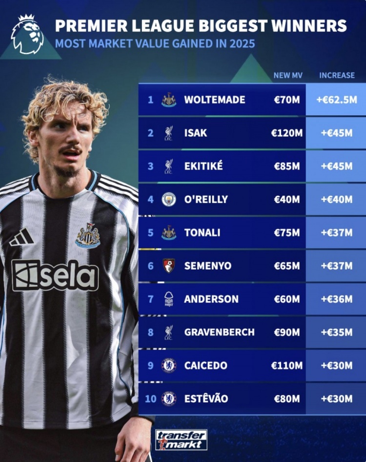 گېرمانىيە « يۆتكىلىش بازىرى » تورى 2025 - يىللىق ئېنگلاند ئالىي بىرلەشمىسىدىكى توپچىلارنىڭ قىممەت ئۆرلەش رەت تەرتىپىنى ئېلان قىلدى ، ۋولتېرماند 62 مىليون 500 مىڭ ياۋرو ئۆرلەپ بىرىنچى ئورۇندا تۇرغان .